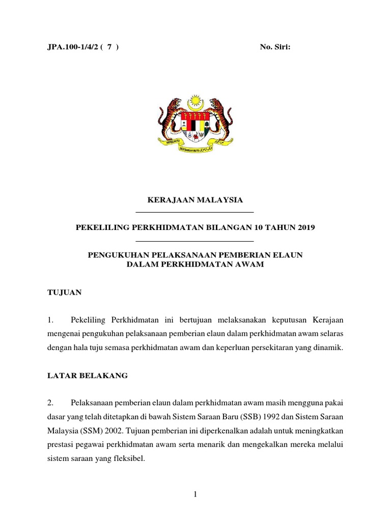 Surat pekeliling perkhidmatan bilangan 9 tahun 2013 pemakaian two three piece suit pants bagi pegawai awam wanita semasa bekerja. Pekeliling perkhidmatan bilangan 14 tahun 2008 borang opsyen. Dengan berkuat kuasanya pekeliling perkhidmatan ini, pekeliling perkhidmatan,surat pekeliling perkhidmatan, garis panduan dan surat edaran berkaitan dengan kursusinduksi seperti mana berikut adalah dibatalkan:(a) surat pekeliling perkhidmatan bilangan 2 tahun 1992;(b). Kerajaan malaysia pekeliling perkhidmatan bilangan pekeliling perkhidmatan bilangan 2 tahun 2013 penambahbaikan. 1 tahun 2012 definisi 'gaji baru' bermaksud amaun gaji yang telah diberi kenaikan mengikut peratusan yang ditetapkan berkuat kuasa 1 januari 2012.